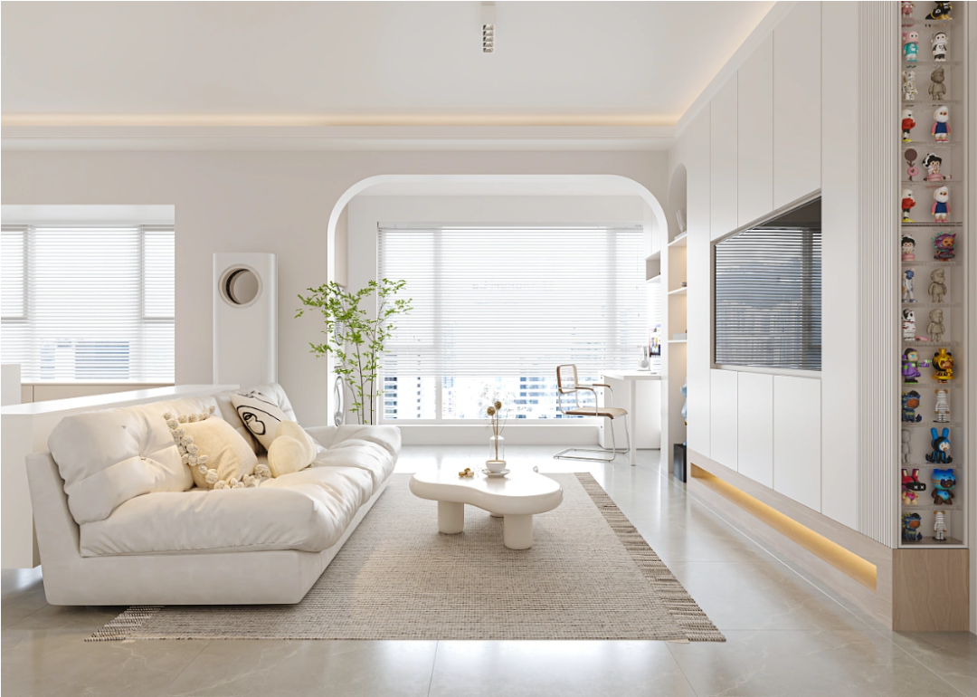 百叶窗的设计,使整体空间更加通透明亮。电视柜侧面做装饰柜设计,摆放手办装饰。