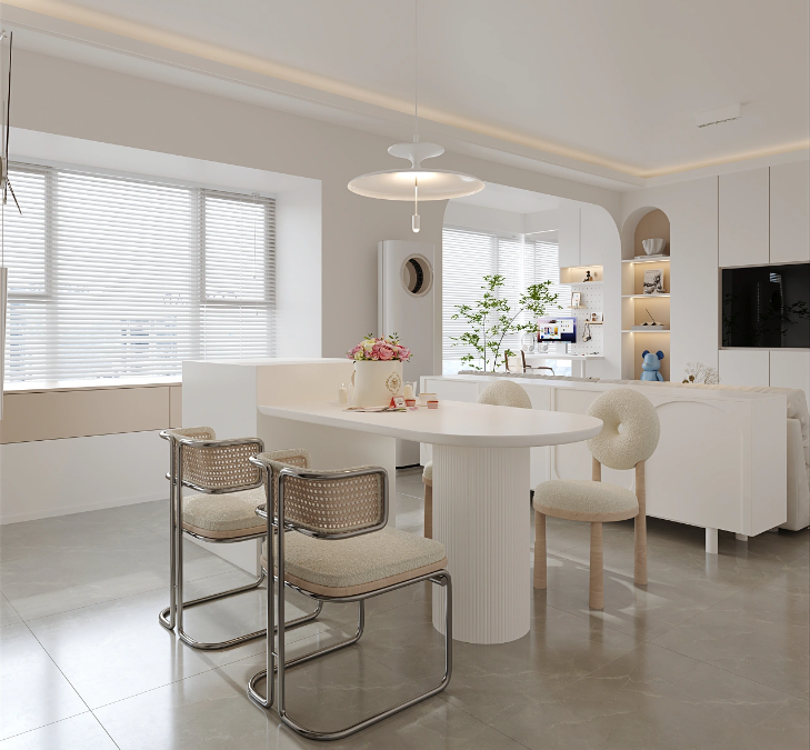 客厅与餐厅之间设计一个矮柜进行隔断。精美造型的灯具,可以增加餐厅的艺术氛围。餐桌+岛台一体的设计,搭配上羊羔绒材质的餐椅,从视觉和触感上都给人以温暖、治愈的感觉。