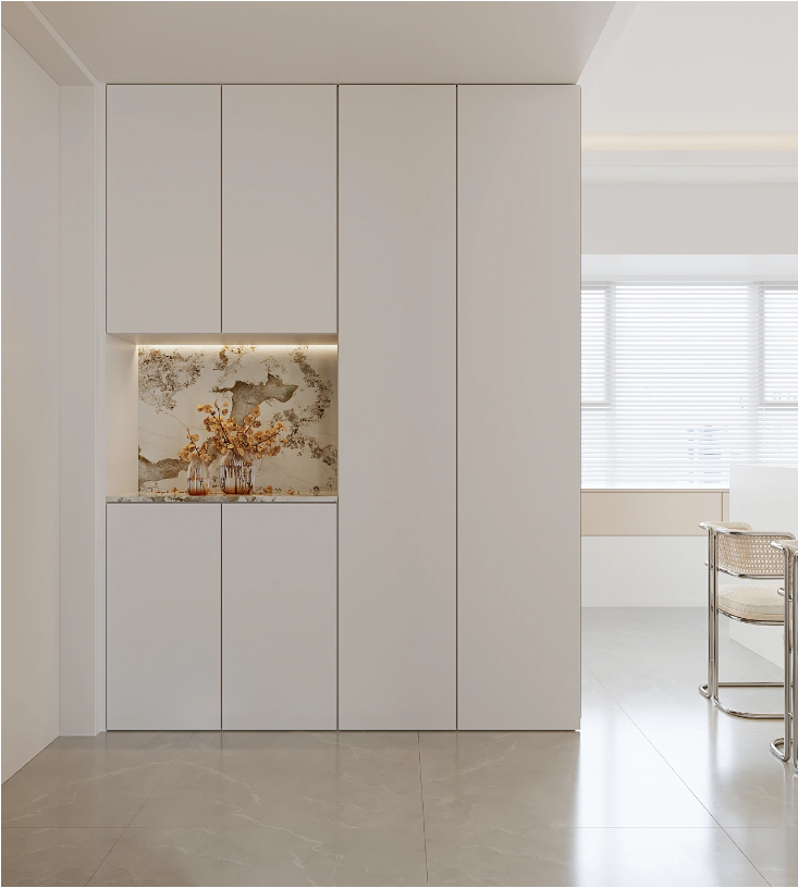 入户玄关柜做一门到顶的设计,平板造型的柜门做免拉手设计,开放格的背板设计岩板装饰,嵌入灯带衬托出柜体的高级美。