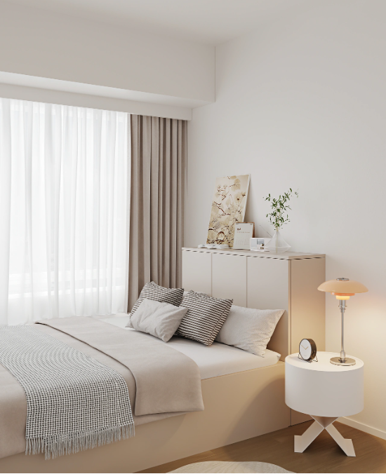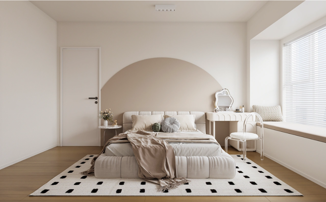 主卧设计,墙面石膏板做圆弧造型,刷奶咖色乳胶漆,呈现出温柔唯美的气质。飘窗做软包设计,摆放一个靠枕就能舒适的在飘窗享受风景。