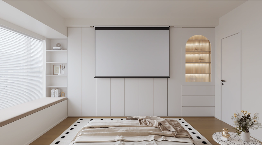投影仪的设计,在家就可以享受影院快感。飘窗设计开放格,作为装饰架与书架使用。一门到顶的衣柜,简约又大气。抽屉盒上面的柜门做圆弧形设计,嵌入高级感十足的长虹玻璃,在灯带的烘托下更加唯美。