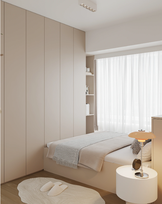 榻榻米+衣柜一体的设计,可以充分的利用空间;奶咖色的色调,既不像白色那么有距离感,又不似黑色那么厚重。