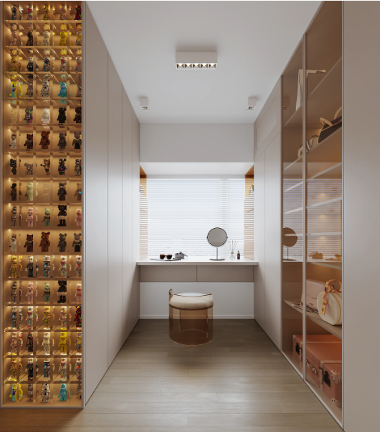 衣帽间设计,利用自然光线,靠窗设计化妆桌;一门到顶的衣柜侧面设计装饰架,摆放精美的手办装饰;柜体做不同尺寸的隔板设计,便于摆放不同的物品,玻璃柜门在灯带的装饰下,具有时尚感和独特魅力。